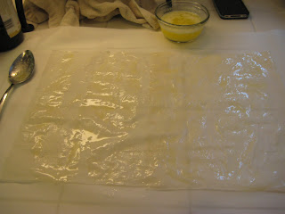 Step 4: layer your fillo dough by laying down one sheet and brushing it with butter. Repeat nine more times.